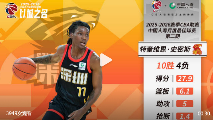 北京时间2月6日,CBA官宣2025-26赛季第二期奖项,深圳男篮成为大赢家,本土核心贺希宁当选月度最佳国内球员,深圳男篮外援史密斯当选月度最佳国际球员。