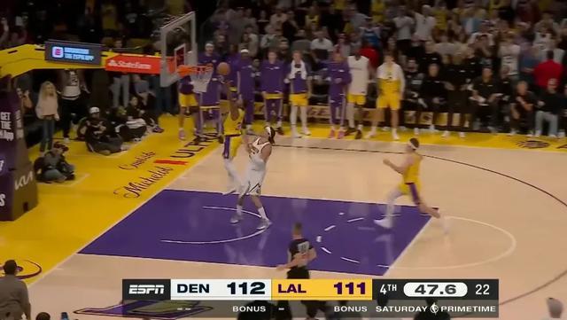 第四节比赛,掘金的三分手感彻底打开,单节15中7的三分,其中在两侧底角就进了6个。好在湖人这边也能续上火力,没有彻底崩盘,里夫斯末节14分让湖人等到了东契奇的复苏。东契奇之后的三分+三次罚球,让比赛重新回到同一起跑线。